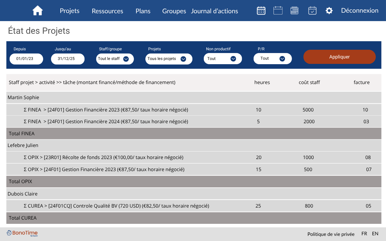 Explorez dans les fonctionnalités avancées BonoTime, conçu pour simplifier et optimiser la gestion du temps au sein de votre organisation, vous permettant ainsi de maximiser l’efficacité opérationnelle et de répondre aux exigences les plus strictes de vos projets.